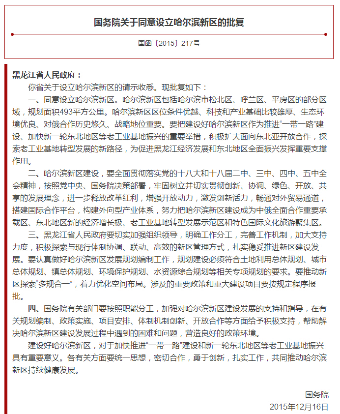 國務(wù)院關(guān)于同意設(shè)立哈爾濱新區(qū)的批復(fù)