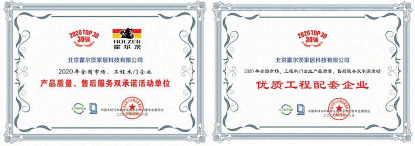2020年6月18日,中國木材與木制品流通協(xié)會(huì)木門窗專業(yè)委員會(huì)年會(huì)上,憑借對產(chǎn)品的精益求精、服務(wù)標(biāo)準(zhǔn)的強(qiáng)有力執(zhí)行與貫徹、生態(tài)環(huán)保理念的深入發(fā)展等優(yōu)勢,北京霍爾茨家居科技有限公司再次榮獲“2020年全國市場、工程木門企業(yè)產(chǎn)品質(zhì)量、售后服務(wù)雙承諾活動(dòng)單位”榮譽(yù)稱號(hào),并依托自身完善的體系建設(shè)以及強(qiáng)大的技術(shù)支持,被授予“優(yōu)質(zhì)工程配套企業(yè)”榮譽(yù)。
