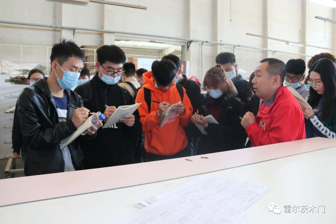 品牌部經(jīng)理管玲超及北京一廠廠長韓磊帶領(lǐng)師生一行參觀展廳及工廠。期間,同學(xué)們結(jié)合了自己所學(xué)的知識踴躍提問,一番熱烈的交流后,對霍爾茨木門家居產(chǎn)品技術(shù)及生產(chǎn)過程有了更深入全面的了解。