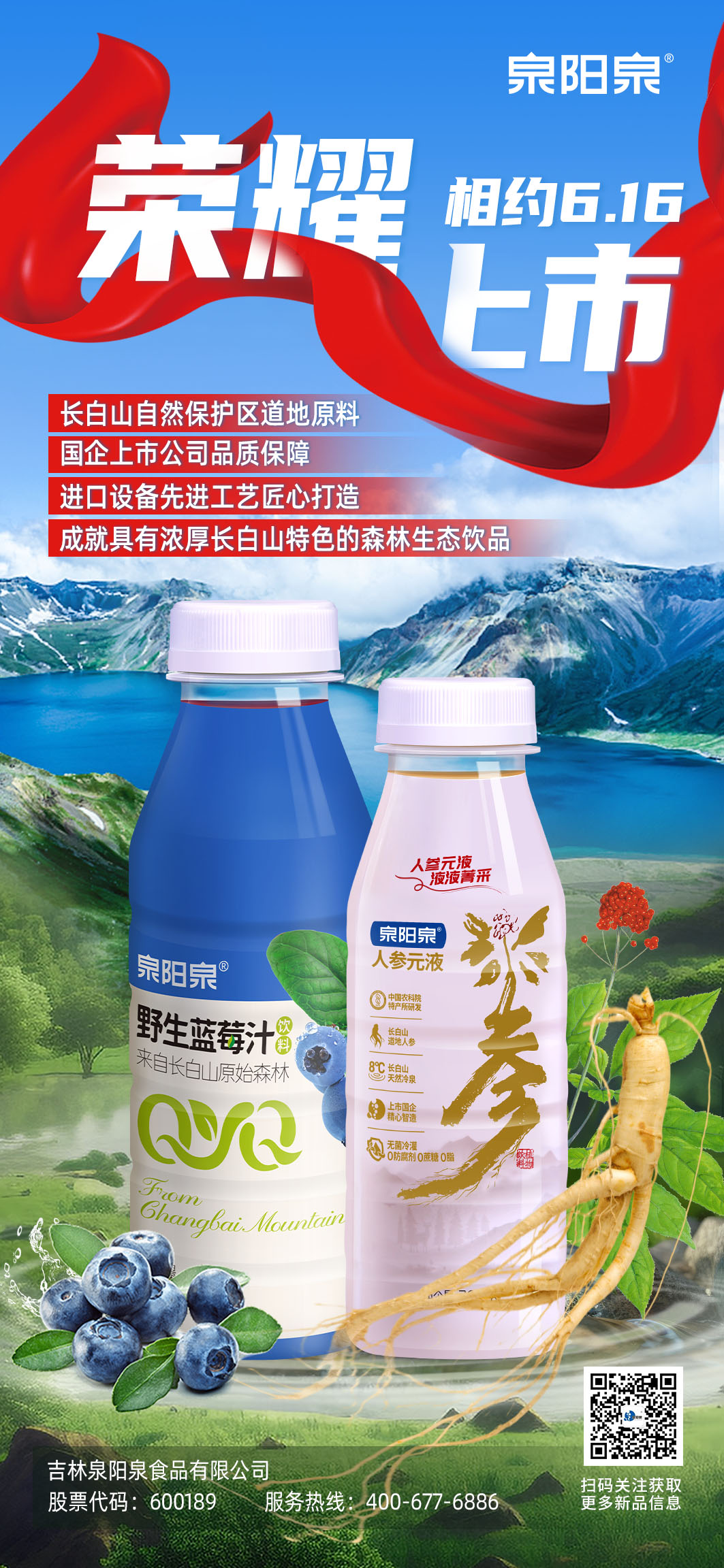 2023年6月16日,吉林泉陽(yáng)泉食品有限公司旗下首發(fā)產(chǎn)品人參元液和野生藍(lán)莓汁飲料榮耀上市!